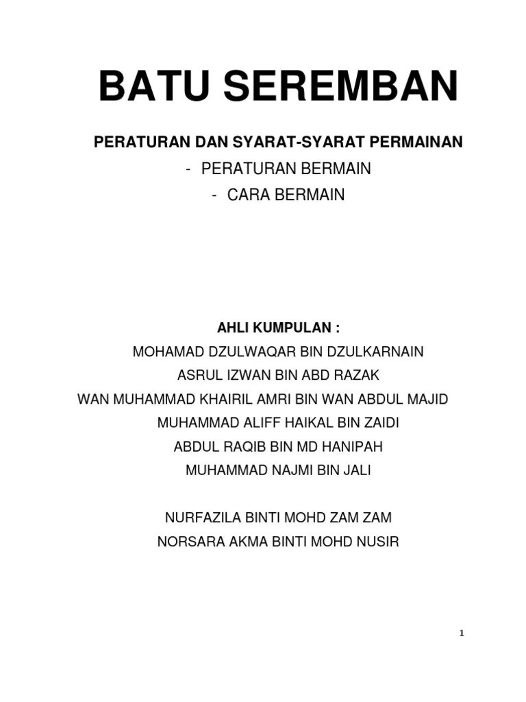 Powerpoint presentation peraturan pelaksanaan pendidikan inklusif1. ٢٧ جمادى الأولى ١٤٣٦ هـ. Mati permainan • sekiranya ibu tidak dapat disambut atau semasa mengutip buah di atas lantai tangan. · how to play batu seremban / 5 stones · the ultimate time saver?? Asal usul batu seremban dikenali juga sebagai selambut atau serembat. Batu seremban juga dikenali sebagai batu selambut atau serembat. Permainan tradisional batu seremban · ingat lagi tak? Asal usul batu seremban batu serembat juga dikenali sebagai batu selambut atau serembat. Batu seremban juga dikenali sebagai batu selambut atau serembat. 3.0 peraturan permainan pemain tidak boleh menyentuh buah yang tidak diambil. Asal usul batu seremban batu serembat juga dikenali sebagai batu selambut atau serembat. Sekiranya terkena tangan, dikira batal dan giliran bermain ditukar. Selambut atau juga dikenali sebagai batu seremban atau serembat ialah sejenis permainan tradisional yang dimainkan di malaysia.